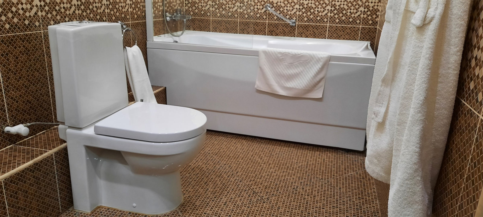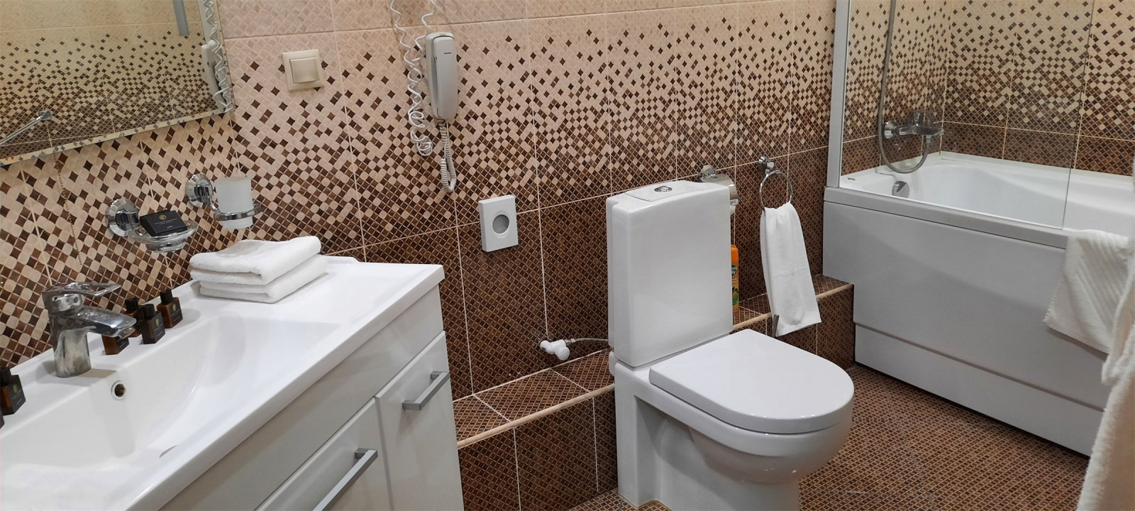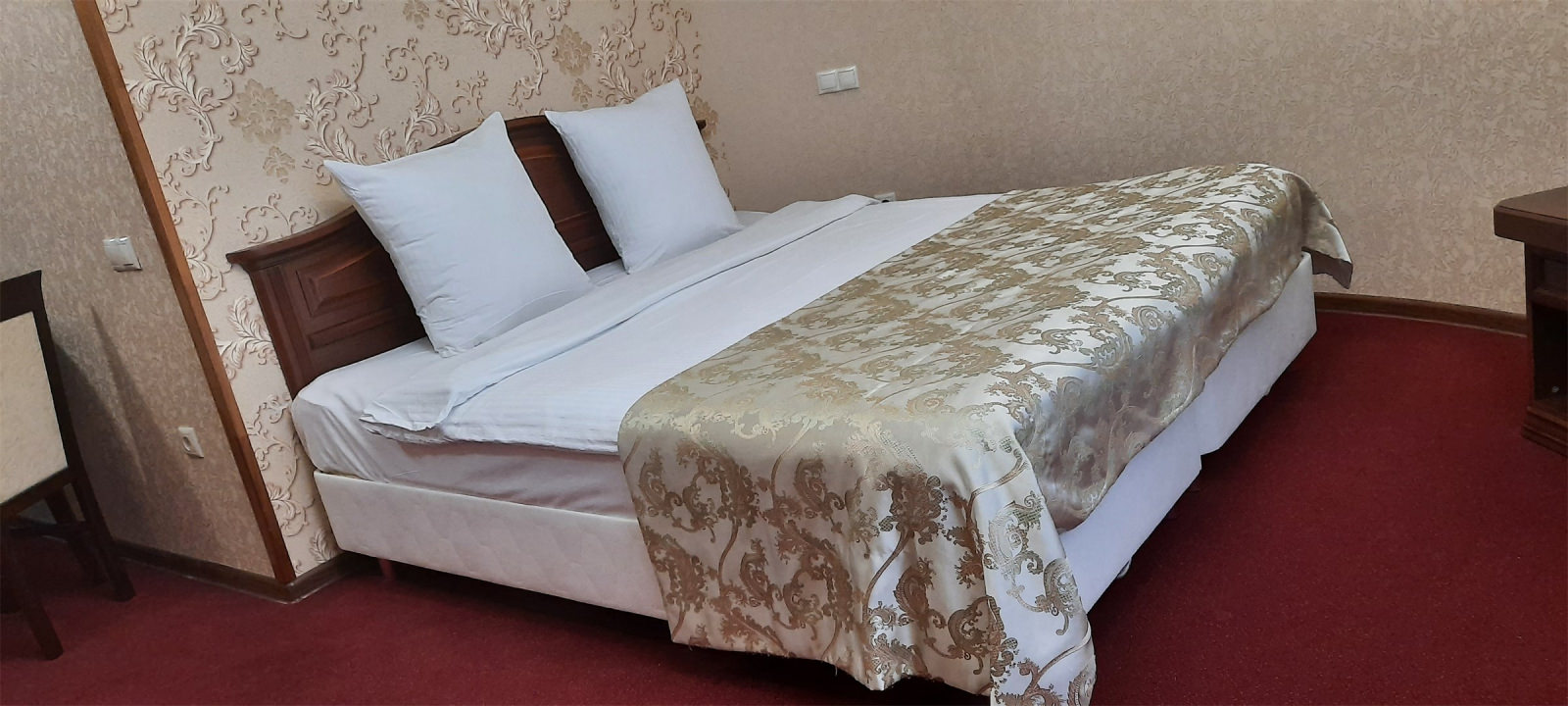 Площадь номера - 30 кв.м. 2 осн. места. Мебель: вешалка, зеркало, кровать двуспальная, прикроватная тумбочка, стол, стул, тумба под телевизор, шкаф. Оборудование: мини-холодильник, система общего кондиционирования, телевизор, телефон, чайный набор посуды, электрочайник. Санузел: с ванной/душем, тапочки, туалетные принадлежности, фен, халат. Сервис: Wi-Fi бесплатно, смена полотенец, смена постельного белья, уборка номера.