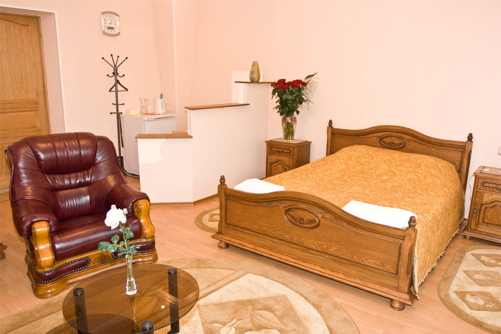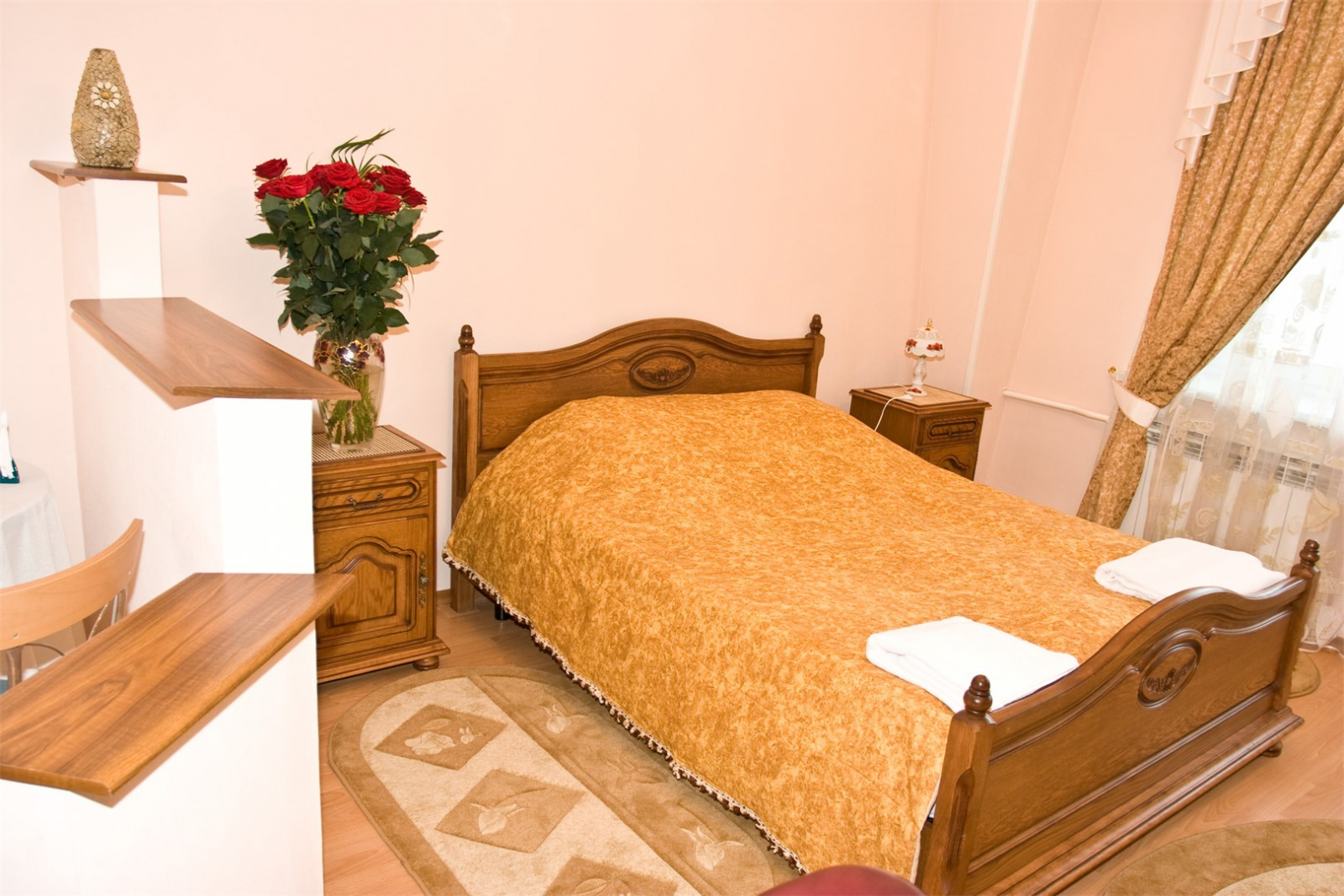 Площадь номера - 39 кв.м. 2 осн. места. Балкон. Мебель: вешалка, зеркало, кресло, кровать двуспальная, прикроватные тумбочки, стол, стулья, шкаф. Оборудование: мини-холодильник, система общего кондиционирования, телевизор, телефон, чайный набор посуды, электрочайник. Санузел: с душем или ванной, тапочки, туалетные принадлежности, фен, халат. Сервис: Wi-Fi бесплатно, смена полотенец, смена постельного белья, уборка номера.