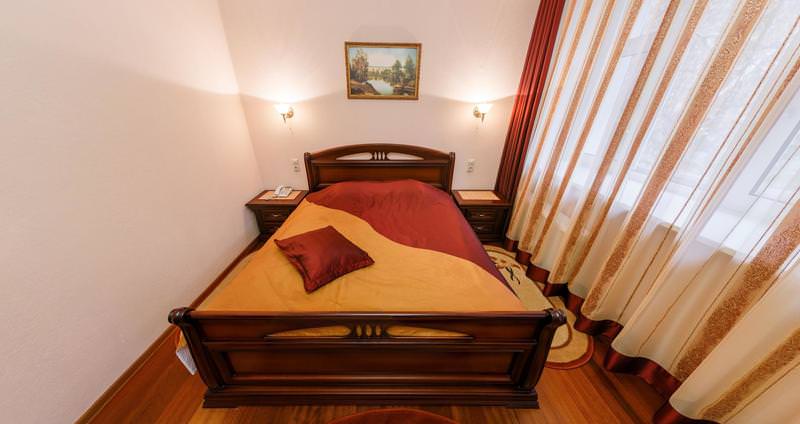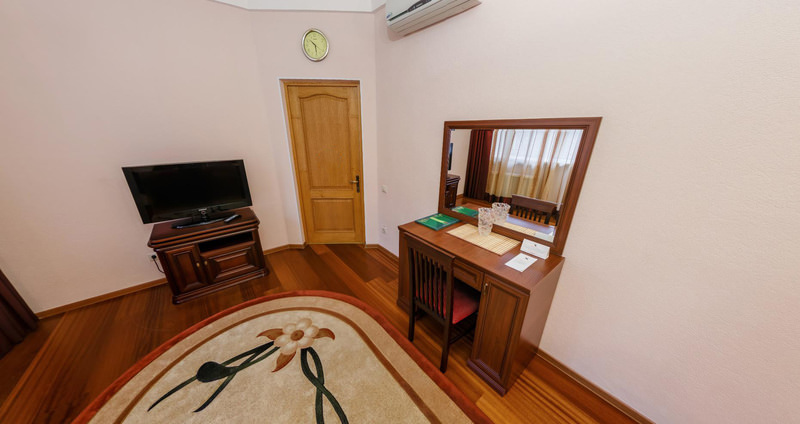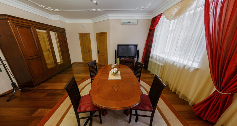 Площадь номера - 80 кв.м. 2 осн. места. 2 доп. места. Балкон. Мебель: вешалка, зеркало, кровать двуспальная, прикроватные тумбочки, стол, стулья, шкаф. Мини-кухня. Оборудование: мини-холодильник, сейф, система общего кондиционирования, телевизор, телефон, чайный набор посуды, электрочайник. Санузел: с душем или ванной, тапочки, туалетные принадлежности, фен, халат. Сервис: Wi-Fi бесплатно, смена полотенец, смена постельного белья, уборка номера.