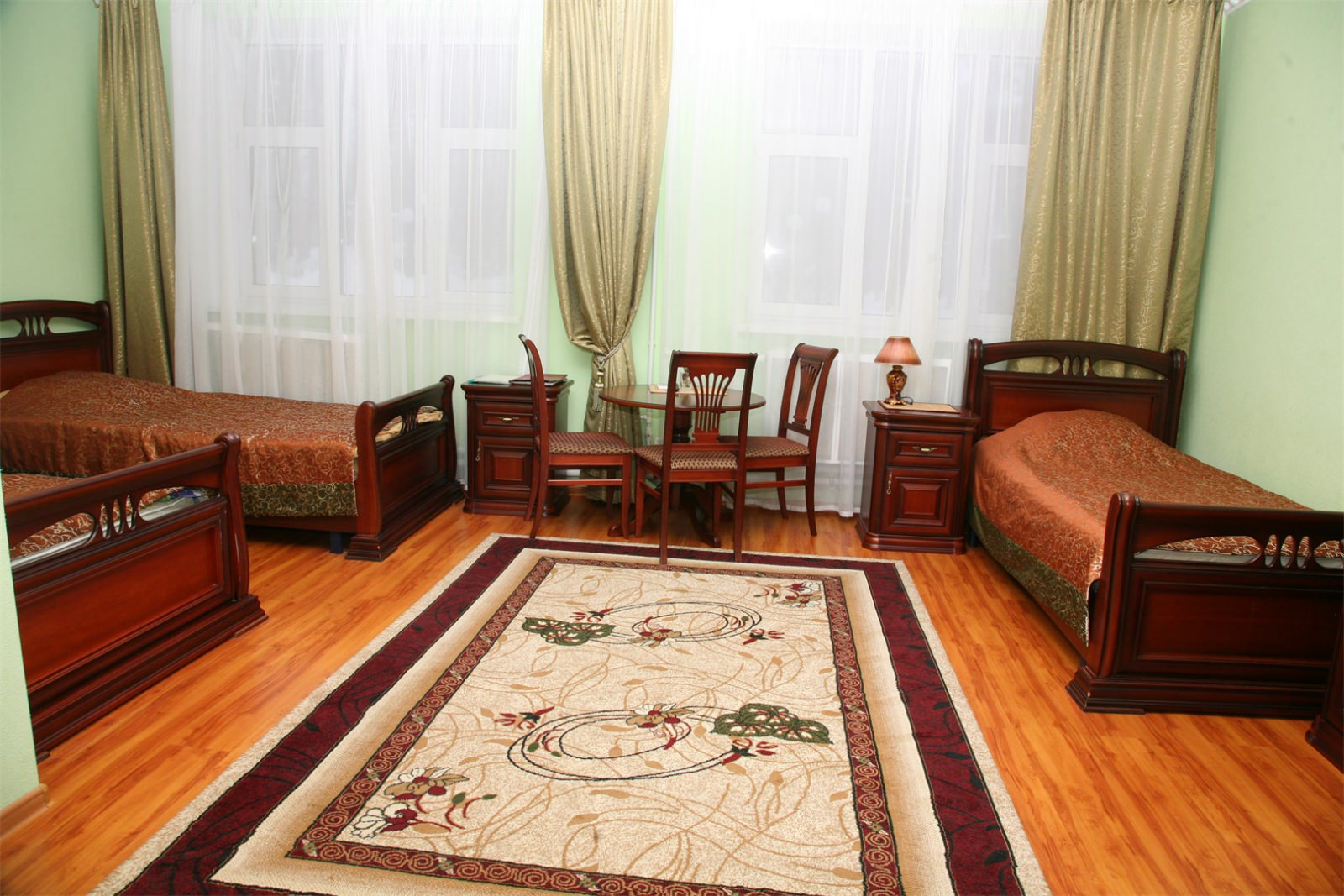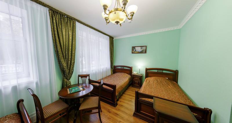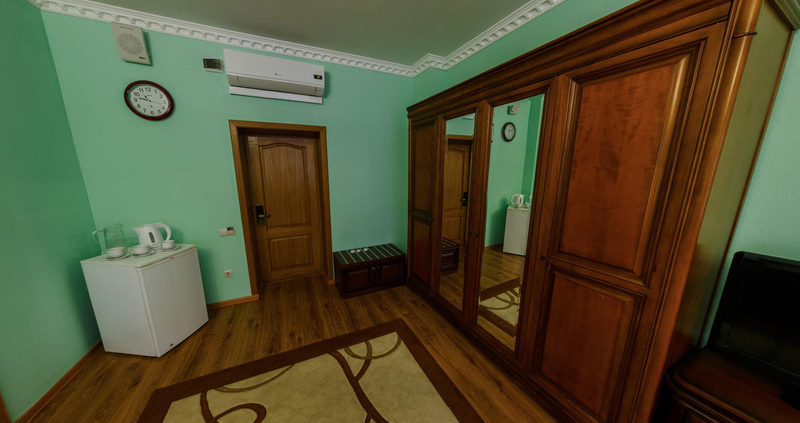 Площадь номера - 34 кв.м. 3 осн. места. 2 доп. места. Мебель: вешалка, зеркало, кровати полутороспальные (3), прикроватные тумбочки, стол, стулья, шкаф. Оборудование: мини-холодильник, система общего кондиционирования, телевизор, телефон, чайный набор посуды, электрочайник. Санузел: с душем или ванной, тапочки, туалетные принадлежности, фен, халат. Сервис: Wi-Fi бесплатно, смена полотенец, смена постельного белья, уборка номера.